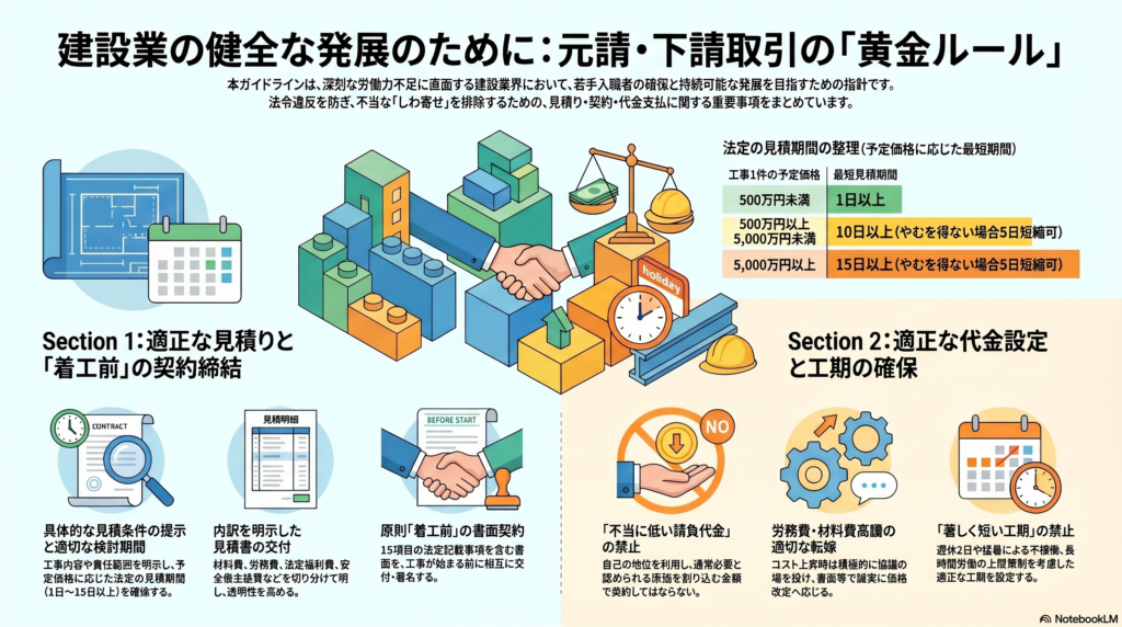 同時に、元請負人側には提出された内訳付き見積書の内容を尊重・考慮する義務が明示された。つまり、「内訳付き見積書を受け取っておきながら、総額を一方的に値引きする」行為は建設業法違反に該当しうる行為として明記されている。